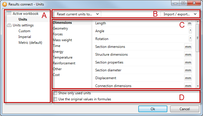 - The Reset current units to... drop-down list allows you to change the measurement system which will be used in the active workbook.