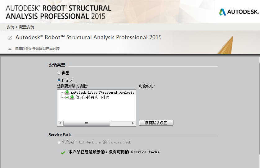 在安装程序的“安装”>“配置安装”页面上,单击 Autodesk Robot Structural Analysis Professional 栏以显示配置区域。