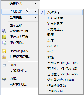 若要显示所有流体面(入口、出口和流体区域之间的内部面)上的矢量,右键单击,然后选择全局矢量。从展开的菜单列表中选择所需的数量。