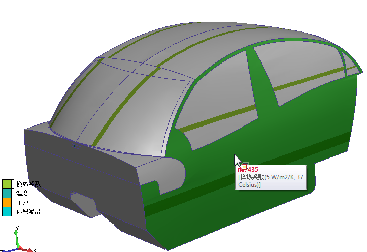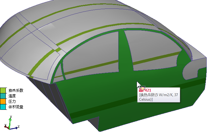 13. 若要模拟热环境中的静止车辆,在乘客座舱的侧面和顶部应用换热系数。选择以下面,然后单击上下文工具栏中的“编辑”按钮: