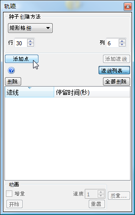 18. 在“轨迹”对话框中,选择“矩形网格”作为“种子创建方法”。将“行”设置为 30,“列”设置为 6。单击添加点。