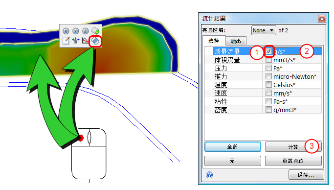 除了对流动和热行为的可视反馈,结果平面还可用于评估定量结果。实时测量结果的方法有三种: