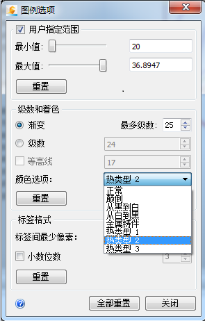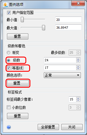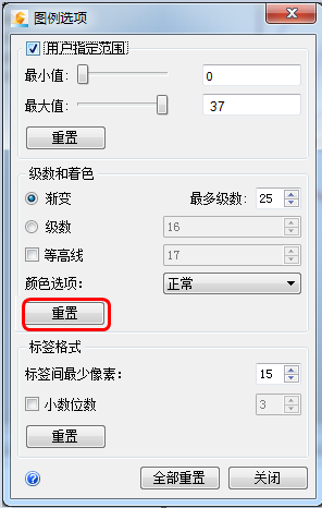 8. 试着修改标签格式和小数位数。单击全部重置,然后单击关闭退出“图例”对话框。