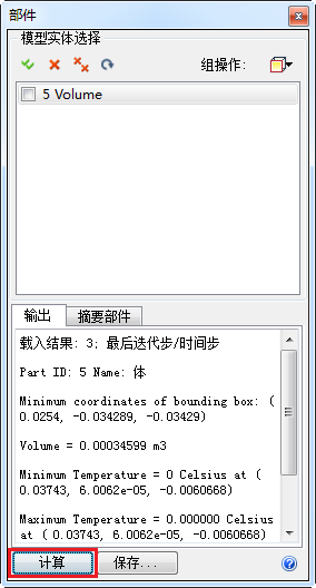 14. 若要计算空气的温度,请选择座舱空气体。在“部件选择”窗口中单击计算按钮,并记下平均、最高和最低温度: