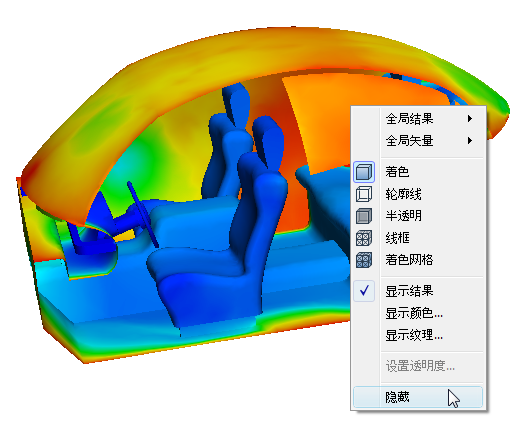 3. 若要显示模型上的温度,请单击鼠标右键,然后选择“全局结果”。从列表中选择“温度”。