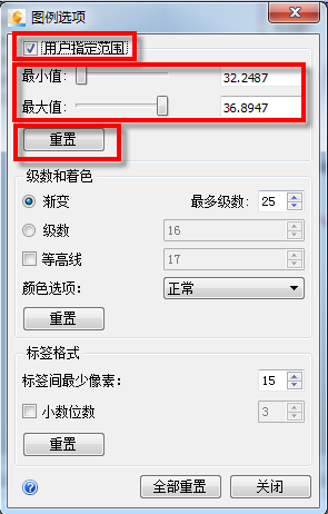 6. 在“图例选项”对话框中,启用“用户指定范围”。使用最低和最高滑块调整图例范围(以查看这样会对结果显示产生怎样的影响)。完成后单击重置。