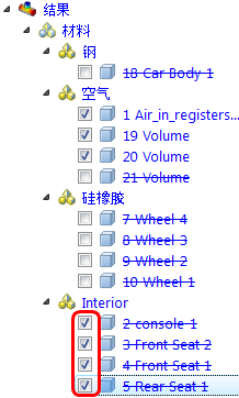 7. 若要为车身着色,请选中“结果”>“材料”分支中“钢”分支下的“车身”部件旁边的框。在所选部件名称上单击鼠标右键,然后选择“着色”。