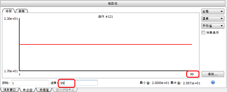 4. 为确定在第 100 次迭代之前流动求解是否收敛,在达到第 100 次迭代之前检查温度变化。将“结束:”字段的值更改为 99 并按 Enter 键。