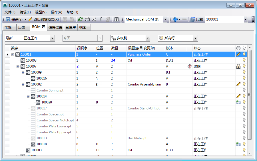 请务必了解“BOM 表”选项卡的图标和状态设置以便以最佳方式管理 BOM 表。