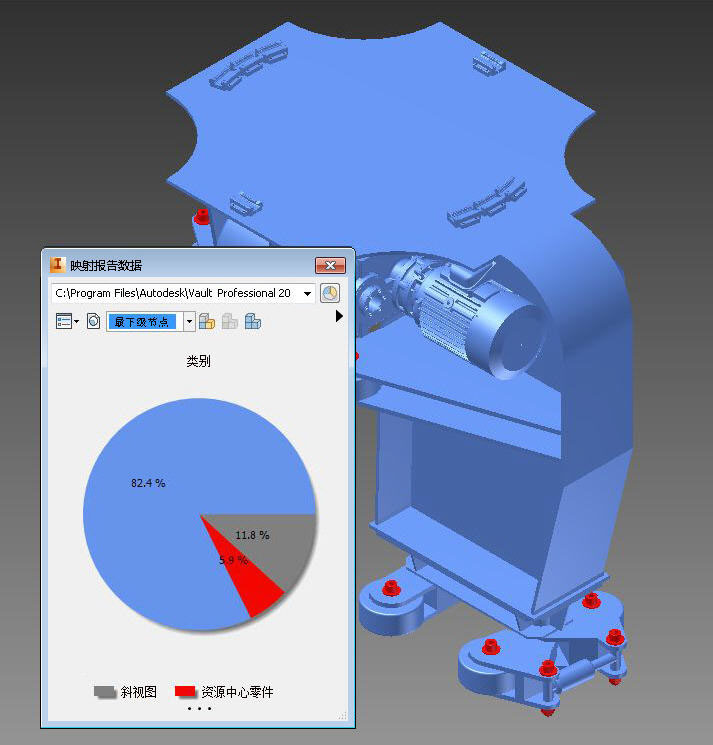 例如,一个饼图图块可能指明大部分文件当前都处于“正在工作”(WIP) 状态。但将数据映射到模型时,只有一小部分文件会根据该 WIP 图块指定颜色。造成显示上的这种差异是因为该图块考虑了附着的文件和零件文件,但是图形区域中只有零件文件可见。您可以查看完整的报告,以了解组成饼图图块的文件的完整列表。