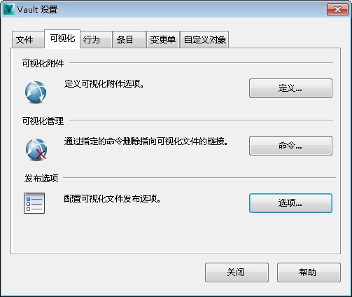 通过“可视化管理”选项,您可以指定哪些命令将会解除 Vault 中的数据文件与其对应可视化文件之间的关联。