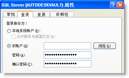 - 双击“SQL Server (Autodeskvault)”服务,然后选择“登录”选项卡。