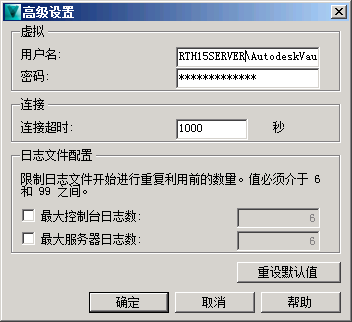 您可以在 Autodesk Vault Filer Server Console 的“高级设置”对话框中配置更多服务器设置,例如模拟帐户、超时阈值以及要保留的控制台和服务器日志的数量。