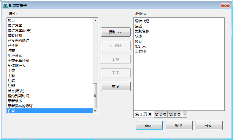 管理员可以在“Vault 设置”的“配置数据卡”对话框中配置数据卡布局。管理员可以在此确定一个数据卡使用多少页以及显示哪些特性以进行修改。通过添加和删除特性以进行编辑这种多功能性,管理员可以简化特性的管理。