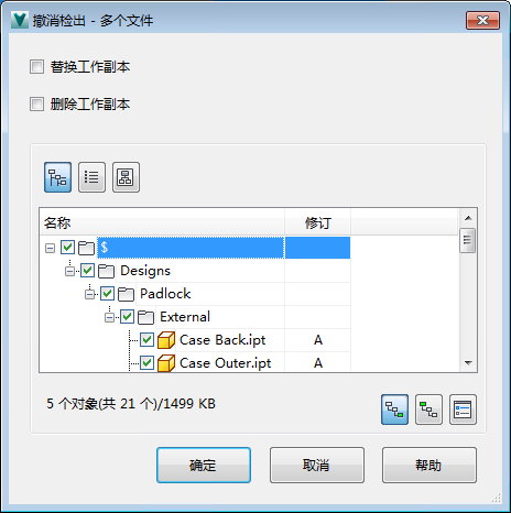在“撤消检出”对话框中,指定是否要用当前存储在 Vault 中的版本替换本地文件,以及是否要删除文件的工作副本。选择“替换工作副本”可以重设对文件的工作副本所做的所有更改。