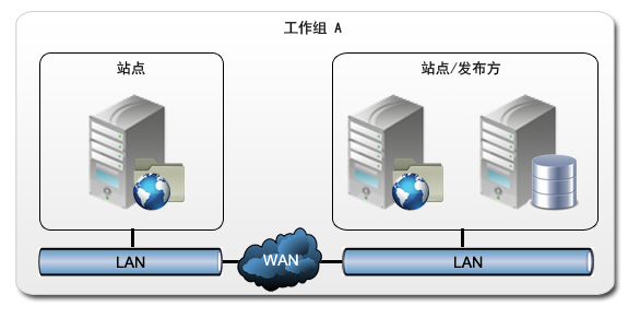 当前状态:工作组 A 包含一个发布方和两个站点。