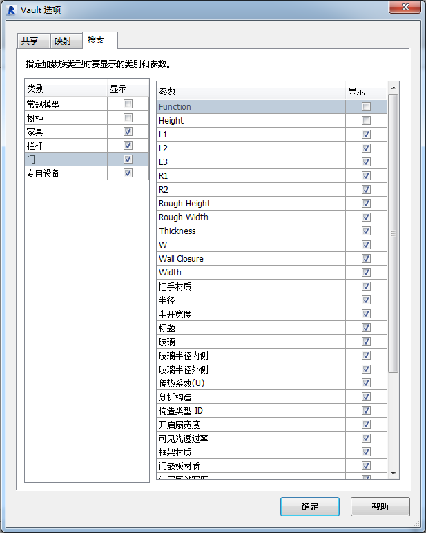 您可以通过在“Vault 选项”对话框的“搜索”选项卡上配置设置,来控制在“加载族”对话框的左侧搜索窗格中显示哪些类别和参数。例如,您可以确定为“门”类别显示什么类型的参数,以及是否要将“栏杆”和“详图索引”标头显示为类别。