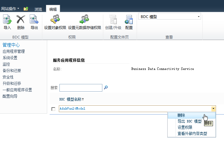 修改的 AdskVultModel.bdcm 必须重新导入到 SharePoint 以替换现有模型。