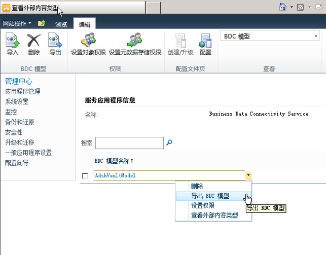 执行以下步骤从 SharePoint 导出 AdskVaultModel.bdcm 文件。
