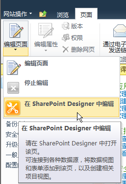 “展开编辑页面”命令,然后选择“在 SharePoint Designer 中编辑页面”。
