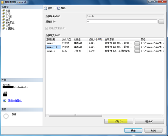 SQLCMD -E -S ".\AutodeskVault" -Q " ALTER DATABASE [tempdb] ADD FILE ( NAME = N'tempdev_2', FILENAME = N'C:\Program Files\Microsoft SQL Server\MSSQL10.AUTODESKVAULT\MSSQL\DATA\tempdev_2.ndf', SIZE = 1024MB, FILEGROWTH = 100MB)"