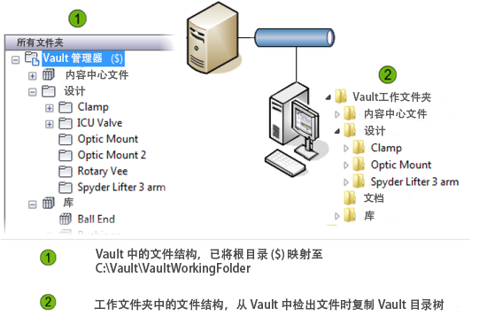 工作文件夹包含从 Vault 中检出的文件的只读副本。检出文件后,从 Vault 中检出的版本将替换工作文件夹中的文件,并且变为可读写以便进行编辑。文件重新检入到 Vault 后,工作文件夹中的本地版本又会恢复为只读。