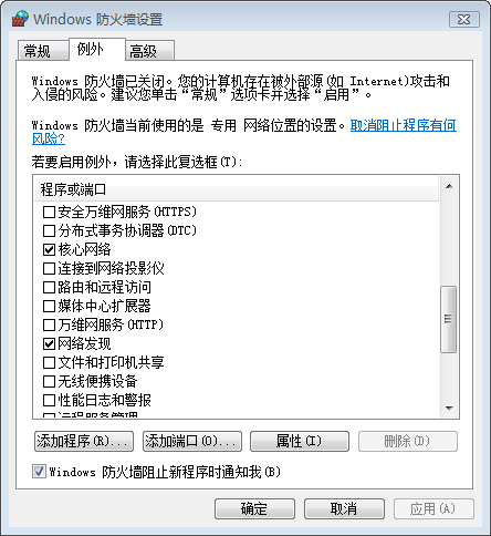 - 在“例外”选项卡上,确认默认的 Web 端口是否已在未被防火墙屏蔽的程序和服务中列出。如果未列出,请单击“添加端口”。
