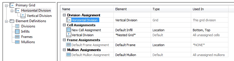 Each grid has its own cell assignments. You assign cells to contain another grid, a panel infill, or an object such as a door or window.