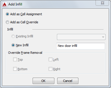 Add as Cell Override and you want to insert a door, window or door/window assembly of a different style than exists in your drawing and remove an edge of the frame surrounding the object select New Infill and enter a name for the object. Then select Top, Bottom, Left, or Right for Override Frame Removal and click OK.