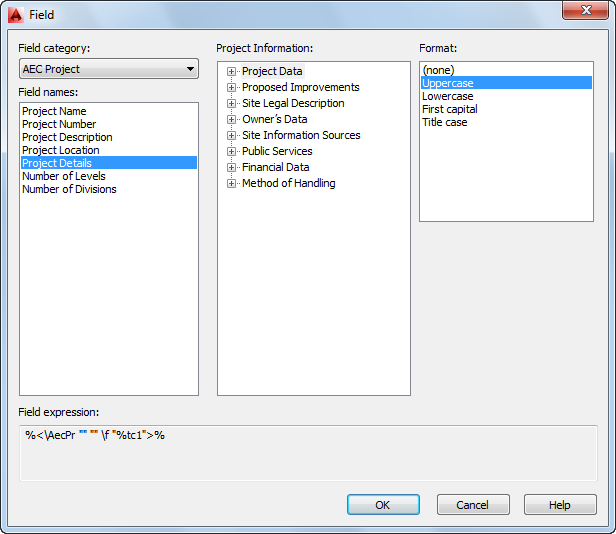 insert a project field into a text element | see Inserting Fields in AutoCAD Text elements. |