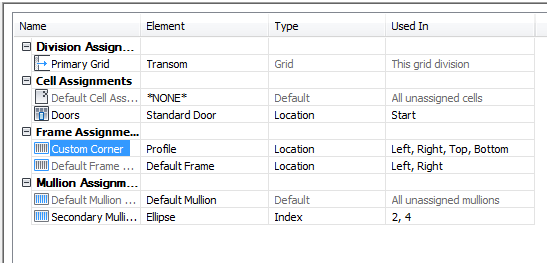 After you have created element definitions for a door/window assembly style, you can assign those definitions to each of the door/window assembly element types: divisions, cell infills, frames, and mullions.