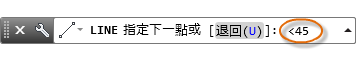 如果您需要以指定的角度繪製一條線,您可以鎖住下一個點的角度。例如,如果您需要以 45 度角建立直線上的第二個點,可在指令視窗中輸入 <45。
