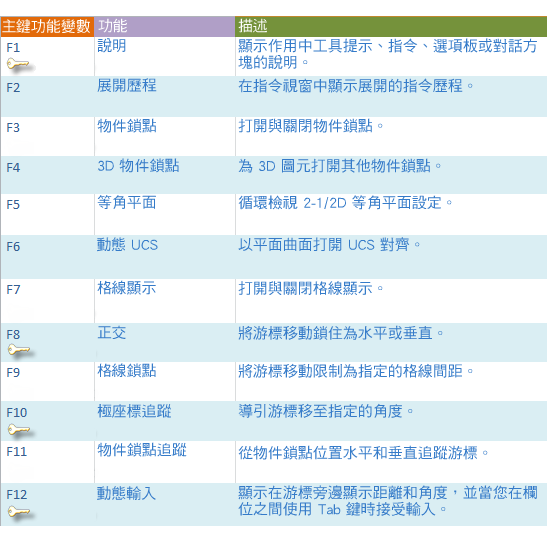 鍵盤上的功能鍵在 AutoCAD 中都具有指定功能。最常打開和關閉的功能都會以按鍵來表示。