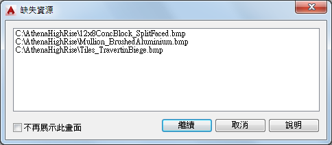 當您彩現具有材質貼圖的場景,但材質貼圖的路徑不再是目前路徑時,則會顯示此對話方塊。當材質貼圖已移動或遭到刪除,抑或是圖檔已移至具有不同磁碟機對映的電腦時,此情況便會發生。