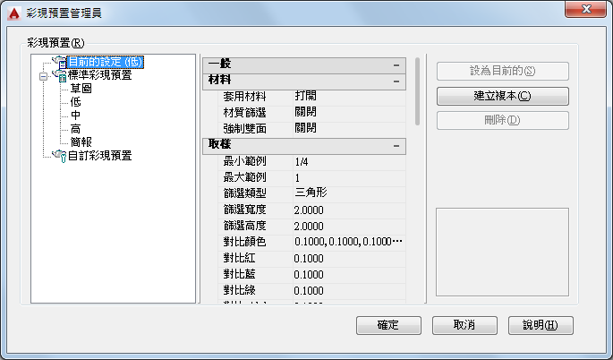 您可透過以下方式審閱和變更圖面中任一預置的彩現設定: