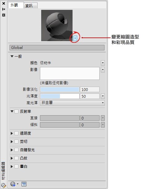 編輯既有材料 (Autodesk 材料資源庫提供的材料),或使用一般材料。您做出的變更將會顯示在材料樣本預覽中。您可以變更顯示在預覽中的影像造型。