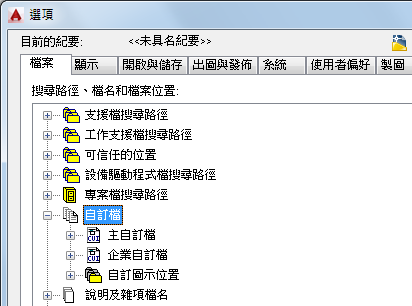 - 在「選項」對話方塊的「檔案」頁籤中,按一下「自訂檔」旁的加號 (+),以展開節點。