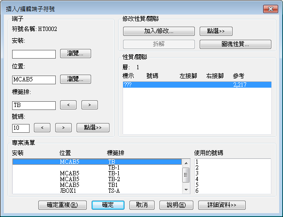 在「插入/編輯端子符號」對話方塊的「專案清單」區段中,選取「標籤排 TB」。