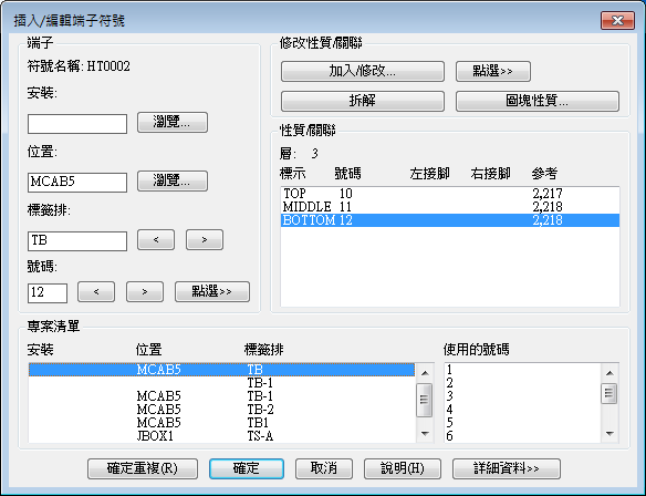- 在「插入/編輯端子符號」對話方塊的「專案清單」區段中,選取「標籤排 TB」。
