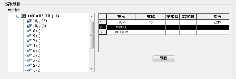 一旦按一下「關聯」後,將使用對話方塊之「作用中的關聯」區段的格線中的端子號更新中間層。