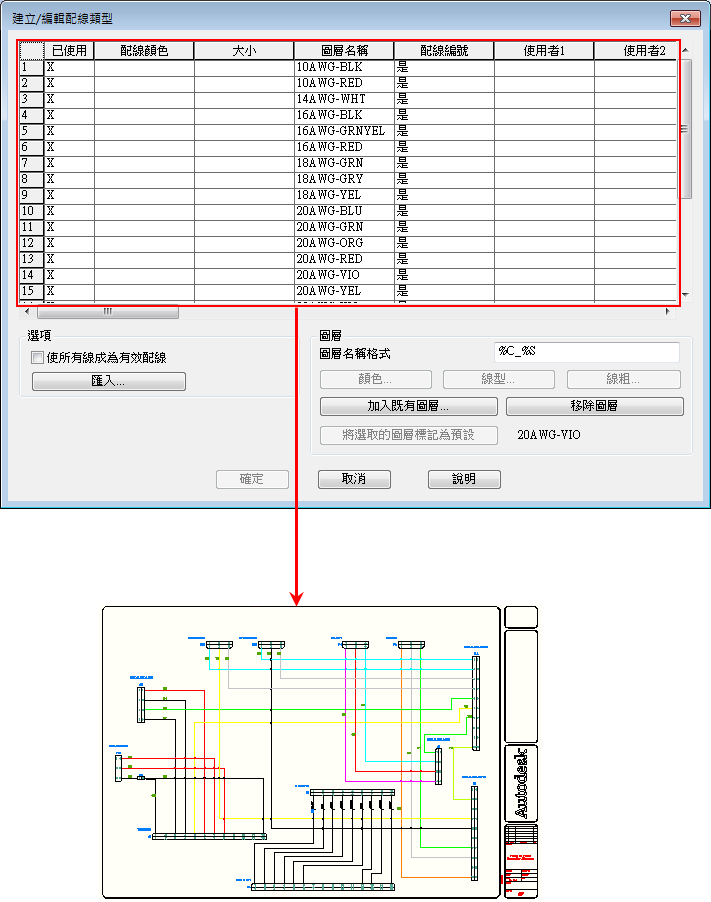 使用「建立/編輯配線類型」工具建立新配線類型或編輯既有配線類型,或使用「變更/轉換配線類型」工具將直線轉換為配線。配線圖層名稱及關聯的配線性質 (例如配線顏色、大小,以及配線圖層是否經過處理以用於配線號碼) 將儲存在圖檔中。以下規則可確定新配線的配線圖層: