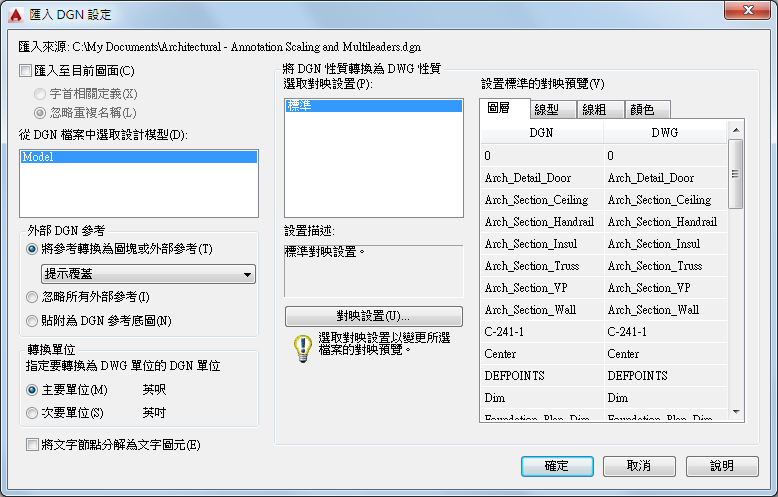 標準為預設對映設置,其從正匯出的圖面中萃取資料並將自動對映套用至 DGN 圖層、線型、線粗和顏色,如對映預覽所示。
