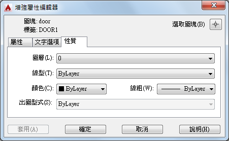 定義屬性所在的圖層以及屬性文字的線粗、線型與顏色。如果圖面使用出圖型式,您可以使用「性質」頁籤為屬性指定出圖型式。