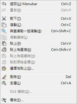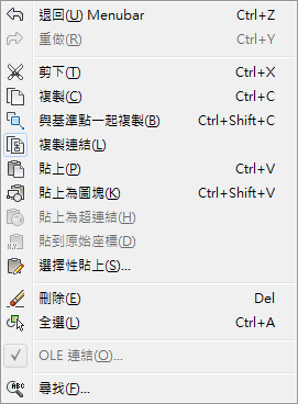 以下範例展示「編輯」功能表上具有勾選標記的「OLE 連結」功能表項目,以及周圍以邊框亮顯的「複製連結」功能表項目影像。