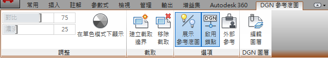 選取圖面中的 DGN 參考底圖時,功能區上會顯示「DGN 參考底圖」關聯式頁籤。