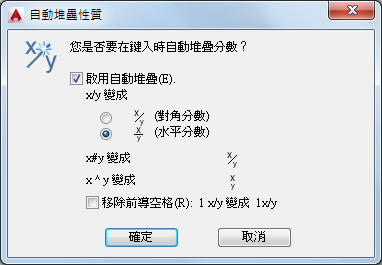 在「自動堆疊」打開時,將斜線字元轉換成水平分數。