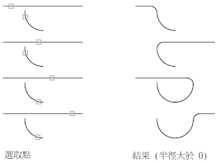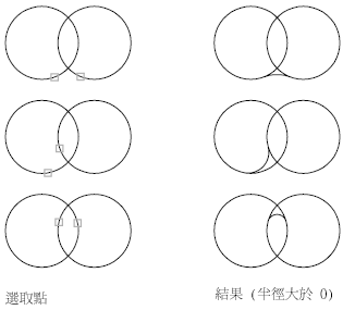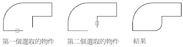 在弧和圓之間,可以有多個圓角存在。選取靠近希望圓角端點所在位置的物件。