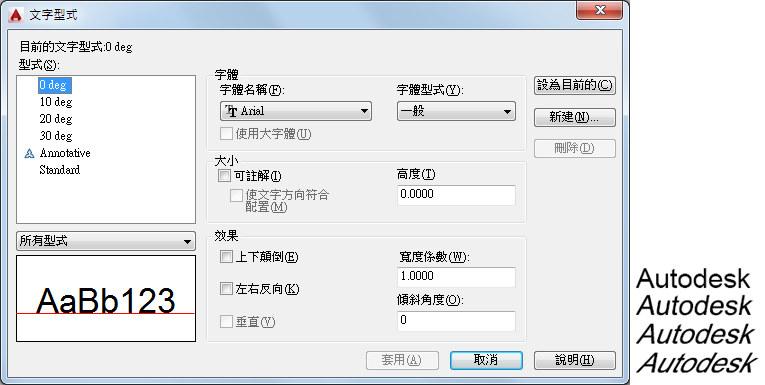 下列圖解展示了不同文字型式所使用的同一字體,其中這些文字型式使用了不同的傾斜設定來定義文字的傾斜。