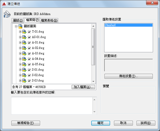 依預設,目前圖面的所有相關檔案 (如相關的外部參考、出圖型式和字體) 都會列出。您可以將檔案加入到傳送套件中,也可以移除既有的檔案。URL 所參考的相關檔案不會併入傳送套件。