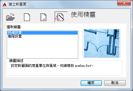 顯示「快速設置」精靈,您可以在其中指定新圖面的單位與區域。快速設置精靈還可以將文字高度與鎖點間距等設定調整至合適的比例。